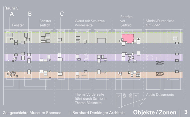 In zone A a frieze of large photos leads to a lead object “Arrest” seen from a distance. Access is limited by a wall with a number of breaks in it, which contain different themes: war economy and forced labour (front), building of the tunnel systems (back). The focus of the room is a model of Ebensee concentration camp. Approaching the model, the visitor can see through a viewing slit a video of the liberation of the camp by the US army.